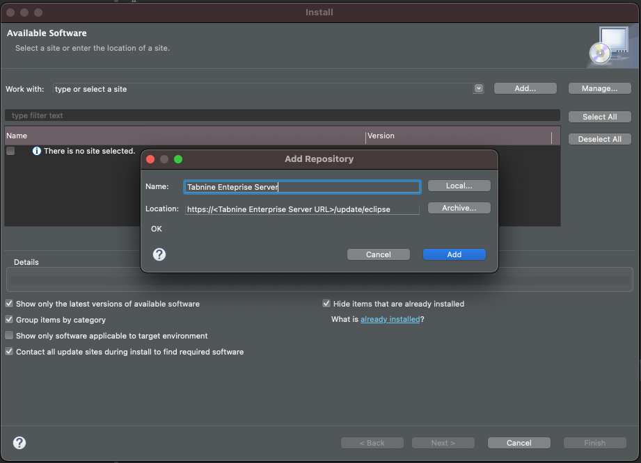 4. Enter the following URL for **Location:** https\://{YOUR TABNINE SERVER URL}/update/eclipse