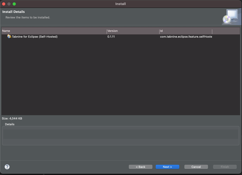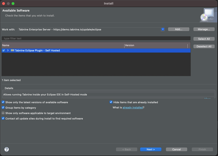 4. Select **Tabnine Eclipse Plugin** **- Self Hosted** and click **Next:**