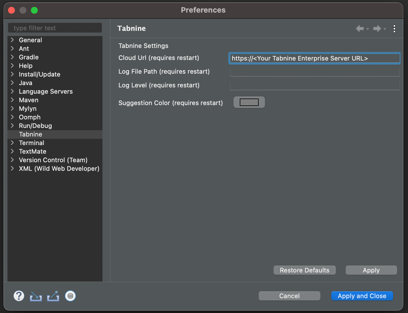 3. Set your Tabnine Enterprise Server URL to \[https\://{YOUR TABNINE SERVER URL}], click <mark style="background-color:blue;">**Apply and Close**</mark>**,** and restart your IDE: