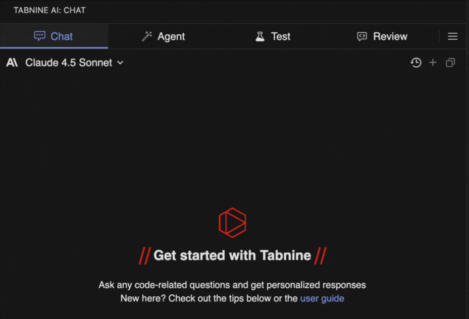 When you open Tabnine in your IDE, look up to the top of the app and select <img src="https://3436682446-files.gitbook.io/~/files/v0/b/gitbook-x-prod.appspot.com/o/spaces%2FY2qxVf5VTm3fmwP4B4Gx%2Fuploads%2Fgit-blob-834a667f9b7e818024bd6df966912c00e085f0c9%2Ficon%3Dmagic%20wands%402x.png?alt=media" alt="" data-size="line">**Agent**.