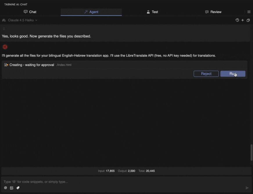 Once you confirm via the prompt box, Agent will generate the files.