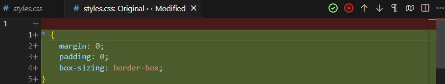 No. On the initial creation, you can do without clicking it because there are no additional changes — the file now exists. For edits, absolutely. Once you click the checkmark, it will automatically close both the original file and the window comparing the original file code (in <mark style="color:red;">red</mark>) to highlighted changes (in <mark style="color:green;">green</mark>).