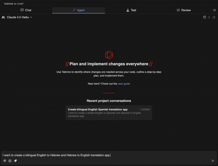 In this example, we ask Agent to plan out a simple translation application. We are explicit though to let us review the plan before coding begins.